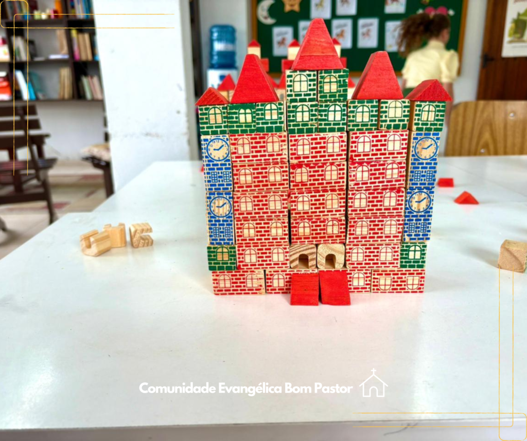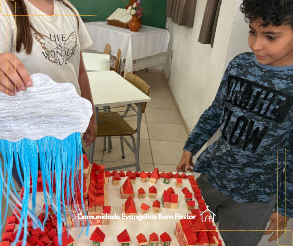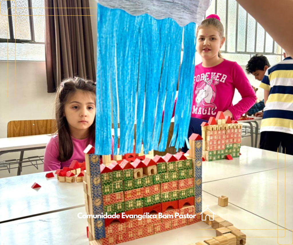 As crianças usaram da criatividade e imaginação para fazer suas construções com blocos de madeira (doação da Xalingo) e fazer o teste da chuva para verificar se foram construídas com o capricho e cuidado relatados na parábola de Jesus. Traga suas crianças para participar também!